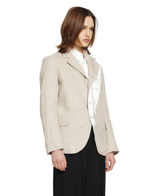 Comme des Garcons' deconstructed linen blazer collapses conventional tailoring, exposing interior and structure to reframe garment as layered architecture.