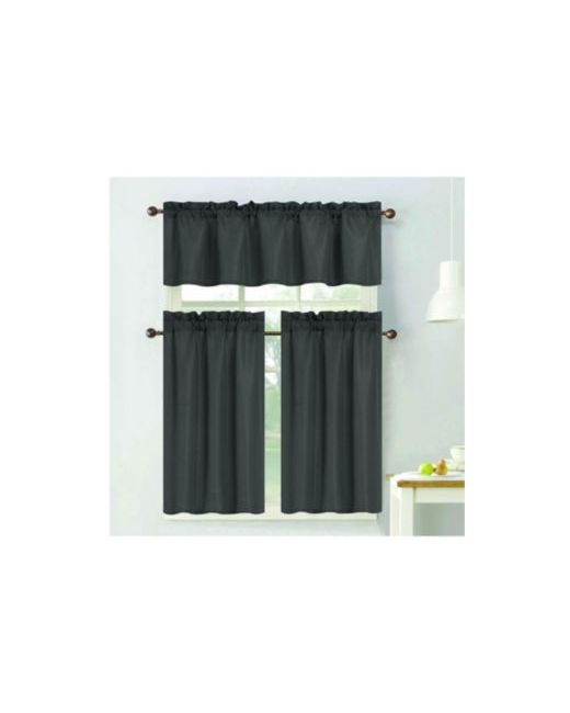 Refresh your kitchen with the clean and contemporary charm of the Gibson Kitchen Curtains Curtain in Charcoal from Rt Designers Collection. Designed in a soft neutral Charcoal tone, this elegant 3-piece set adds warmth and brightness to kitchens, breakfast nooks, laundry rooms, or compact dining spaces.The set includes one tailored valance 54" x 18" and two matching tier 27" x 36" panels, perfectly sized with a coordinating valance for balanced light control and privacy. Crafted from durable, lightweight fabric, it offers a smooth solid finish with a subtle texture that complements modern, farmhouse, and classic interiors. The rod-pocket header ensures quick and simple installation while creating a timeless gathered look. Practical and stylish, this curtain set enhances everyday living with easy maintenance and lasting quality.