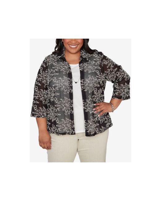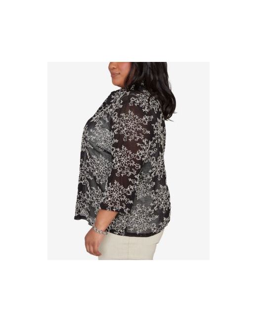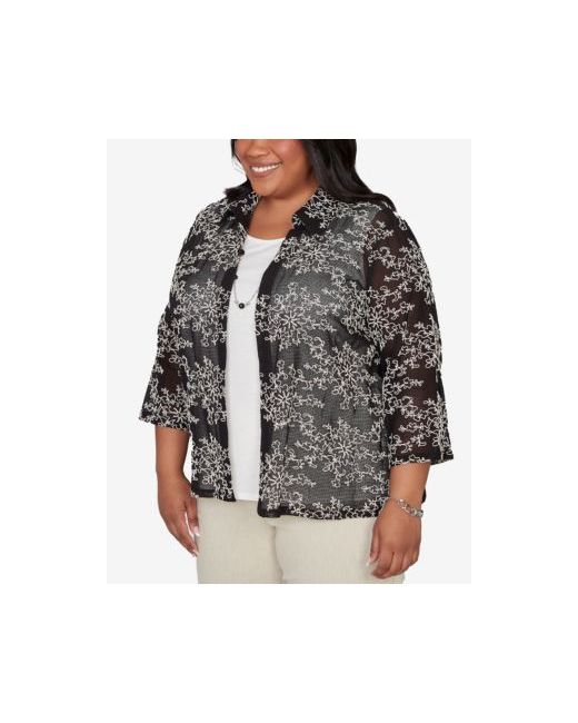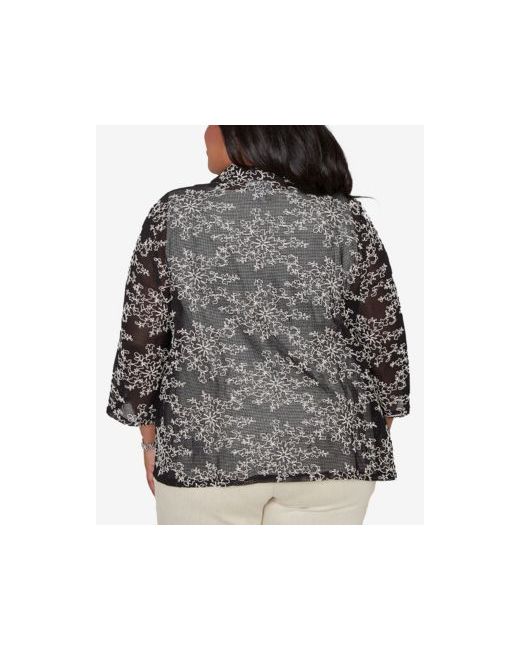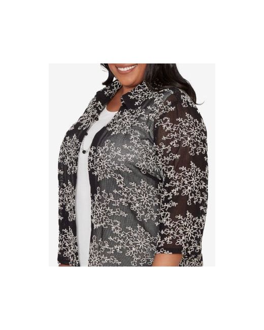 Delicate soutache detailing decorates the mesh outer layer of this two-in-one design. The collared neckline, three-quarter sleeve, and straight hemline offer a refined layered look with soft texture.