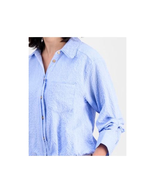 Stylish and tailored, this Democracy shirt features a smocked collar and a button-down front placket for a refined finish. 3/4-length tucked sleeves, a bubble hem, and spliced stripe woven fabric add visual interest, while a single front pocket offers subtle practicality.