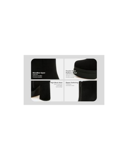 These soft microfiber heel boots mean serious height and serious comfort. With a double platform block heel, side zipper, and plush insole, they re made to power through long days (and nights) without missing a beat. Warm, comfy, and easy to style-what more do you need Type: Boots ,Upper Material: Microfiber ,Outer Sole: Tp Rubber ,Closed Round Toe Double Platform Block Heel ,Side Zipper Closure Paneling Detail ,Soft Cushion Insole Heel Height: 4 inches.
