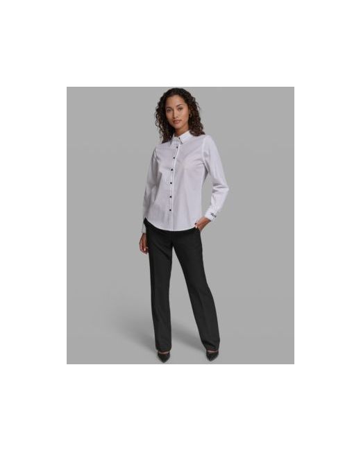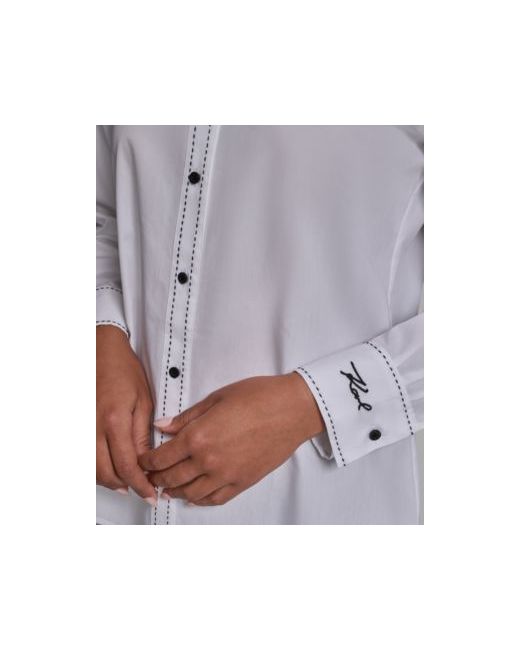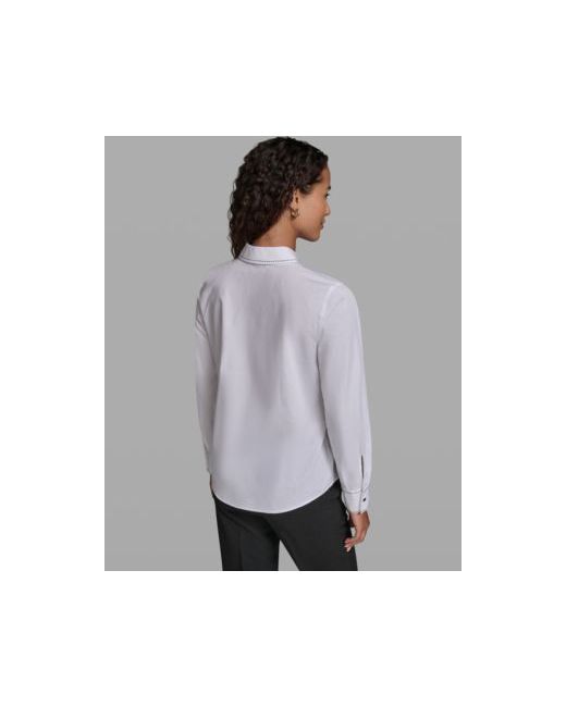 Anchor your wardrobe with elevated essentials like this Karl Lagerfeld Paris blouse, designed with long-sleeves for added coverage. A collared neckline defines the look, while a button-front closure completes its enduring style.