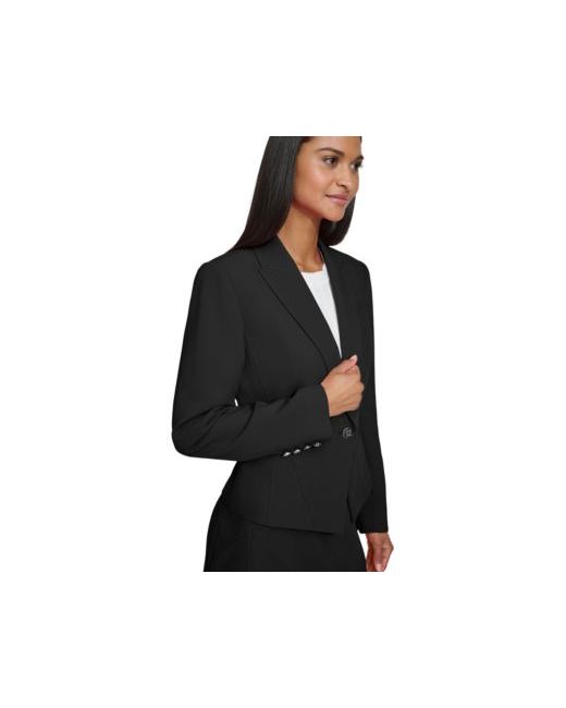 Shiny signature buttons and stylish seaming details update the professional profile of this one-button blazer from Karl Lagerfeld Paris.