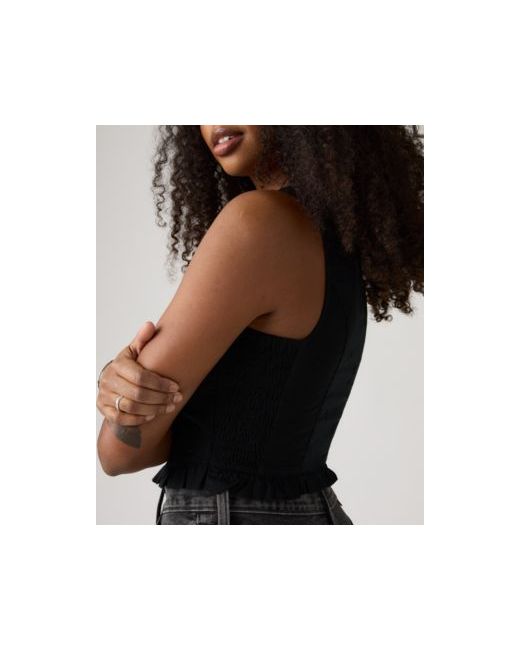 Add a touch of charm to your warm-weather wardrobe with this Levi's blouse, featuring a delicate ruffle at the hem. The button-up front allows for adjustable styling, while the slim fit creates a neat, tailored shape through the bodice. Sleeveless construction and a V-neckline offer a breezy feel that pairs easily with high-rise jeans.