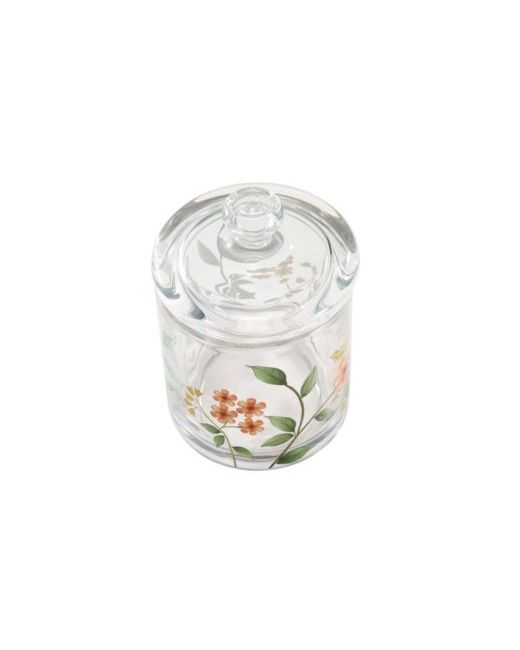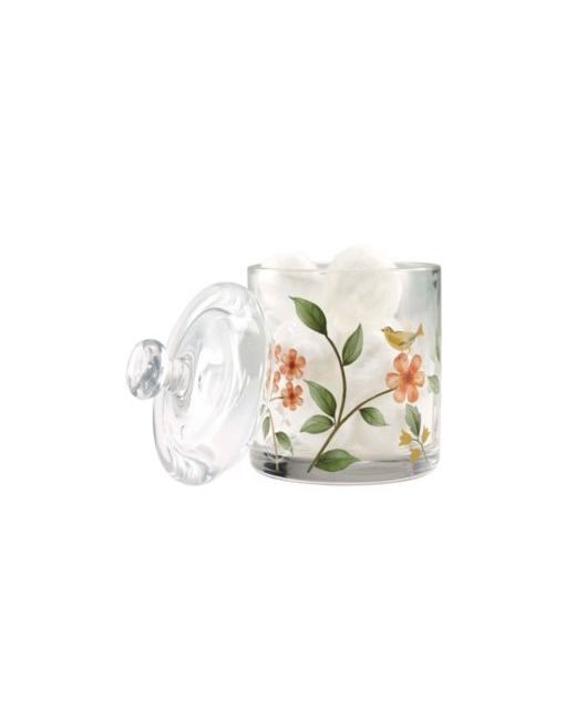 The Avanti pretty birds decorative covered jar features a beautiful floral scene with branches, blue and green leaves, pink flowers and yellow birds on a clear base. Made of heavyweight, durable glass with decal that wraps the entire piece. Top is clear with round pull.