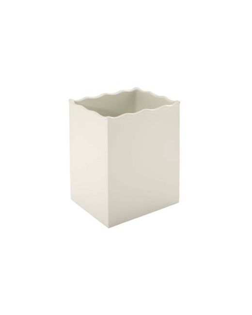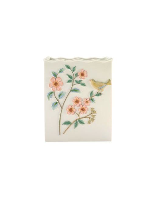 The Avanti pretty birds decorative wastebasket features a beautiful floral scene with branches, blue and green leaves, pink flowers and a yellow bird on an ivory base. The design is embossed, giving it dimension and the top edge is scalloped. Made of durable, hand-painted resin for easy care.