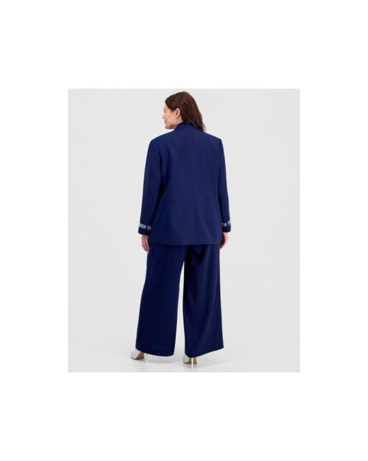 Kasper's plus size jacket features a sleek, minimalist design accented by embellished bracelet sleeves adorned with intricate beadwork and metallic details, adding a touch of elegance and sophistication.