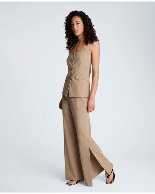 Tailored with a modern twist, this halter vest features a structured silhouette and clean button-front design. The crosshatch weave adds subtle texture, while the open neckline brings a contemporary edge. Polished yet versatile, it’s a refined piece that elevates both suiting and casual looks. WHAT’S IN IT FOR YOU? Halter vest Straight neckline Side flap pockets Three button closure Fully lined 66% polyester, 32% viscose, 2% elastane Dry clean Imported Model Specs: Height 5'10", Bust 29.5", Waist 23", Hips 35" | Kenneth Cole | Crosshatch Weave Four Button Halter Vest With Flap Pockets in TIMELESS TAUPE, Size: XS