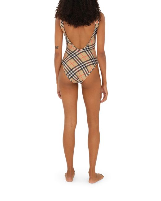 - Plunge-back swimsuit- Stretch nylon- Burberry Check print- Comes with a matching drawstring pouch- Color: Sand