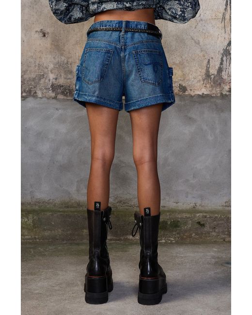 Fitted short inseam shorts with pouch pockets, flap details and single pleats at waist. Built with 10 oz. Japanese selvedge denim and a dark indigo wash with heavy wear pattern.
