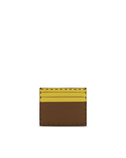 The Selleria Card Holder by Fendi is an elegant accessory crafted from leather-colored Roman leather, featuring six card slots and a central flat pocket. Finished with 100 hand-stitched macro stitches—a hallmark of the historic Selleria craftsmanship—it features a contrasting interior in sunflower yellow leather and the Fendi Roma logo in palladium-finished metal, blending artisanal craftsmanship with contemporary style. Season: SS26 Dimension: 10×8 Composition: 100% Calf Leather Bos Taurus
