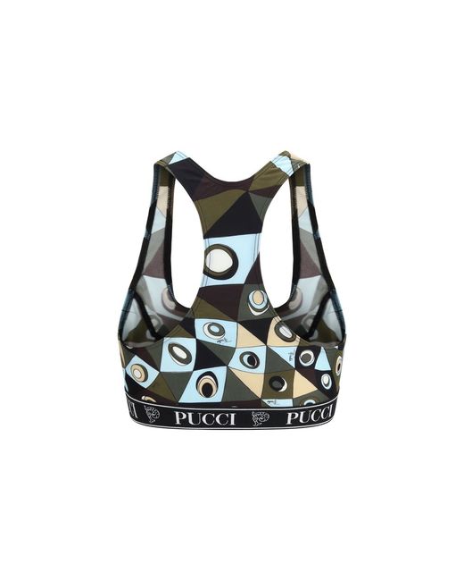 The Occhi-print Top by Pucci stands out for a sporty and contemporary design created to provide support and freedom of movement. The Pucci top is crafted from stretch Lycra and features an elasticated band and wide shoulder straps that ensure comfort and stability. The Occhi print in khaki and blue tones moves across the garment with a bold graphic rhythm, transforming a functional piece into a strong visual statement. The Pucci top balances performance with iconic identity. Season: SS26 Fit: Slim Composition: 80% Polyamide 20% Elastane