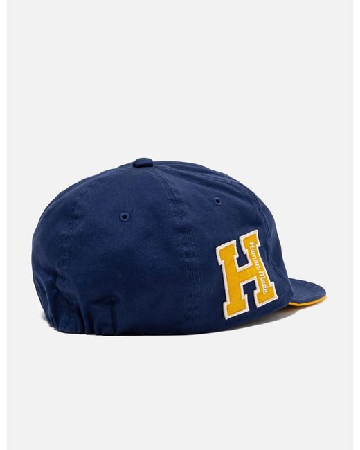 Human MadeBaseball CapVintage-inspiredHigh-density cotton twillWash processed3D felt patch on frontEmbroidered patches on the sidesFlat brimContrasting color under the brimElastic backColor: Navy