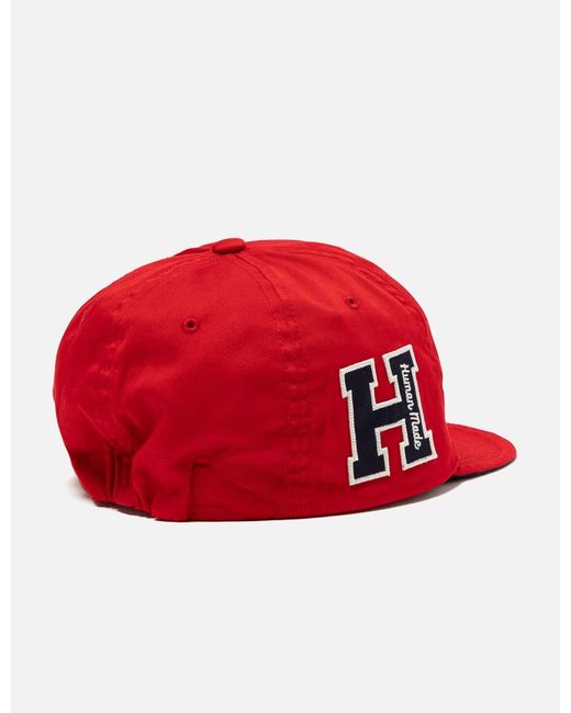Human MadeBaseball CapVintage-inspiredHigh-density cotton twillWash processed3D felt patch on frontEmbroidered patches on the sidesFlat brimContrasting color under the brimElastic backColor: Navy