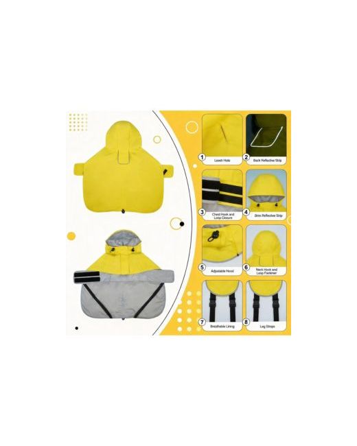 Waterproof windproof polyester shell with breathable mesh lining keeps dogs dry in heavy rain without overheating ideal for active Labradors Huskies German Shepherds machine washable cold quick dry no sleeves design with secure leg straps slips on fast stays in place during play perfect for small Chihuahuas Poodles who hate bulk adjustable semi transparent hood shields head without blocking vision drawstring plus belly magic tape and back cord give custom fit for round Bulldogs or slim Greyhounds reflective strips and leash hole boost night visibility and harness attachment great for Beagles Corgis extended back hem covers belly and legs ultra light 0.3 lb fabric comfortable all day for Golden Retrievers camping or neighborhood walks