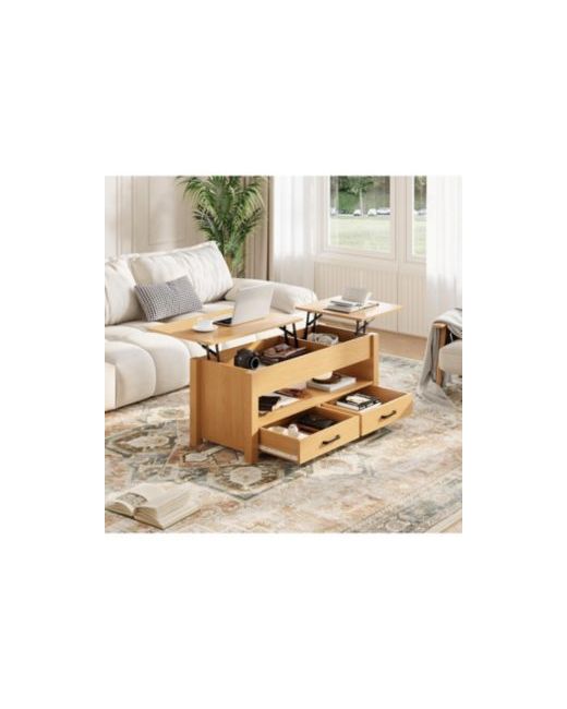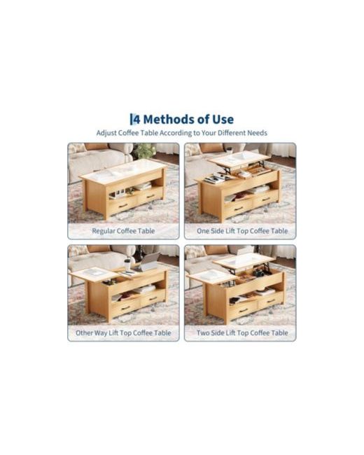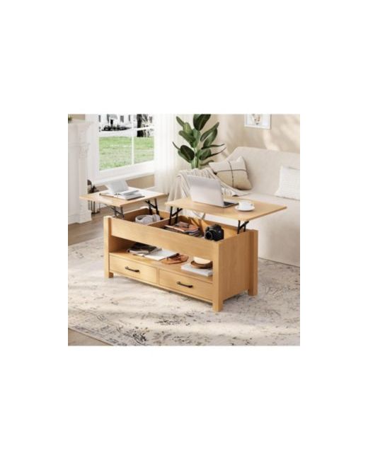 Upgrade your living room with this 47.2-inch lift top coffee table, designed for both convenience and smart storage. Featuring a unique split dual lift-top design, this center table creates two separate adjustable workspaces-perfect for working, dining, or relaxing from the comfort of your sofa. The flexible layout allows you to install the larger lift-top on either side to match your seating arrangement.This coffee table offers generous storage with two hidden compartments beneath the lift-tops and two spacious drawers. Keep laptops, remotes, books, and everyday essentials neatly organized while maintaining a clean, clutter-free tabletop.Built with a sturdy wood frame and equipped with a smooth, silent metal gas lift mechanism, this table ensures stable and effortless lifting for long-term durability. The adjustable height feature allows you to work or dine comfortably without leaning forward, enhancing everyday comfort.