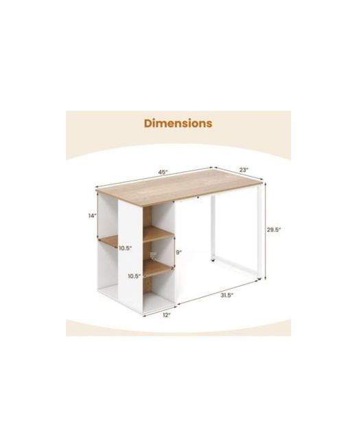 Enhance your workspace with this versatile desk featuring a spacious desktop and five side shelves for optimal organization. Its sturdy construction supports up to 110 lbs, while the elegant wood surface complements any room. Perfect for use as a laptop, writing, study, or vanity desk, it fits seamlessly into your study, bedroom, or office.