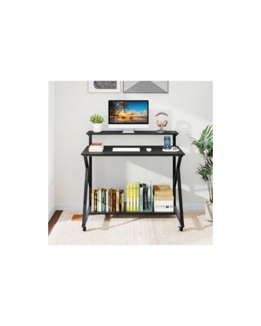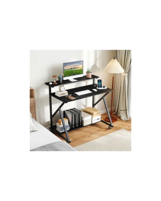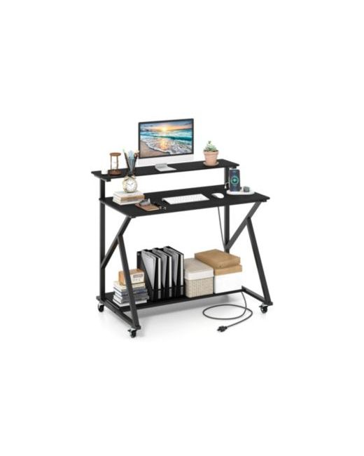 Black Rolling Computer Desk with Charging Station and Monitor Shelf