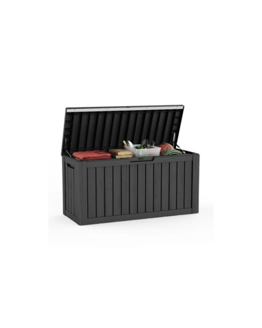 This outdoor storage box offers generous space to organize cushions, tools, sports equipment, pool supplies and more, keeping your patio and yard tidy. Made of weather-resistant resin, it is waterproof, rustproof, peel-proof and dent-resistant for longer life than wooden boxes. Reinforced inner bars prevent warping in strong sunlight, protecting your belongings in hot summers and stormy winters. Designed with two handles on each side for easy moving, a lockable lid for security, and hydraulic rods for smooth, safe opening without finger pinching, it also doubles as a comfortable seat or stylish patio table. With simple instructions and snap-together parts, it assembles in just 10 minutes.