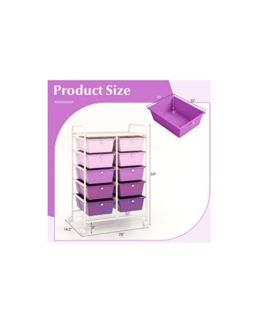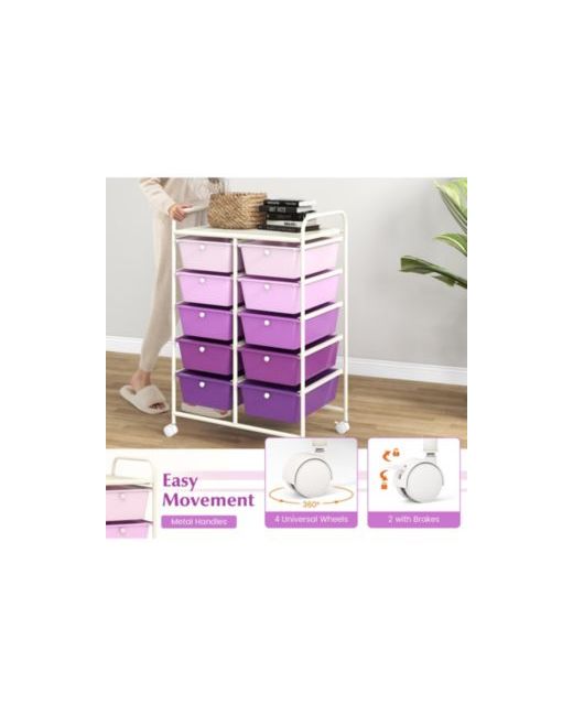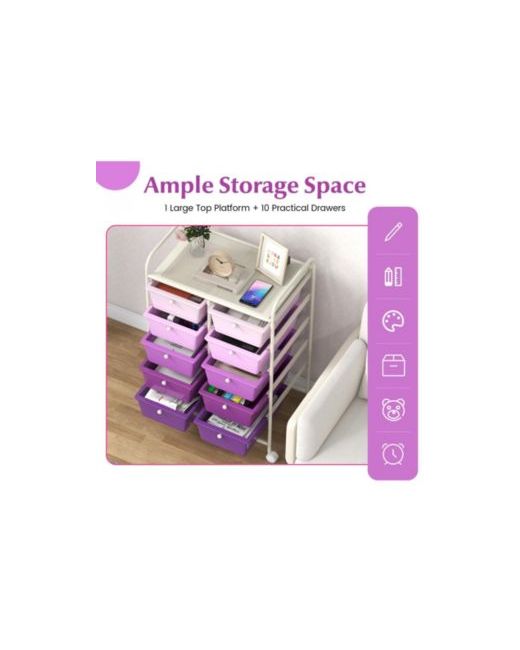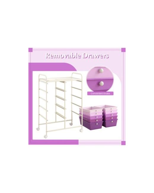 Keep supplies sorted and easy to move with this 10-drawer rolling storage cart, designed with a large top platform and removable drawers for flexible organization. The drawers lift out to use as individual storage bins, making it simple to carry items between work areas, classrooms, or activity spaces, and each drawer includes a pull knob for quick access. A sturdy metal frame provides reliable support for everyday use, while four universal wheels help the cart roll smoothly from room to room, with two wheel brakes to help keep it in place when needed. A practical organizer for offices, studios, kids rooms, and classrooms, and assembly is required.