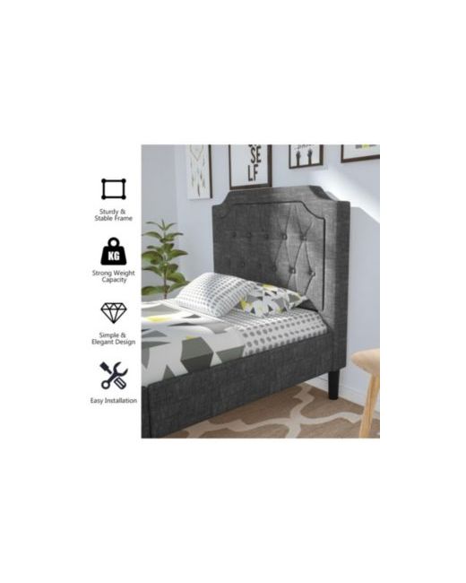Anchoring the bedroom with timeless appeal, this button-tufted platform bed wraps a wood-and-mdf frame in breathable polyester cushioned by thick sponge. The 16 in footboard frames the mattress neatly. Ten wood slats with six side legs and five center legs distribute weight across a 450 lbs capacity. No box spring is required.
