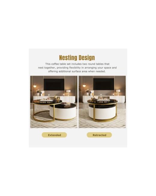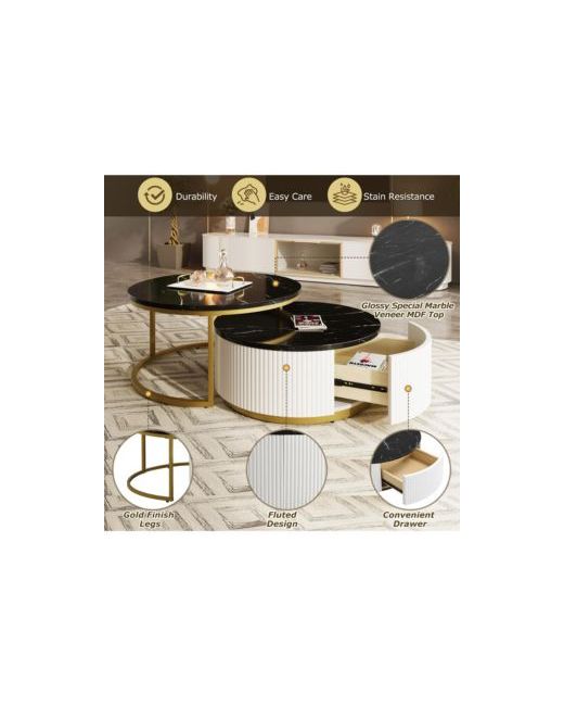 Elevate your living space with this modern round nesting coffee table set, a perfect blend of sleek style and functional design. Crafted with a contemporary aesthetic, this set features two nested round tables that can be pulled apart for extra surface space or pushed together to save room, ideal for small apartments and open-concept living areas. The tables are adorned with elegant groove detailing on the base, adding a refined, textured touch to elevate any modern, minimalist, or luxury home decor. Equipped with smooth-gliding drawers, it offers hidden storage to keep your living room or home office tidy, storing remotes, books, and daily essentials with ease.
