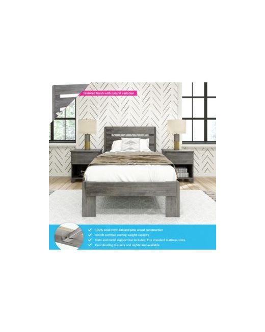 Bring the fun of the farm in with the Modern Farmhouse Twin Bed with Plank Headboard from Max and Lily. With a fabulous barnwood finish and enhanced safety, this bed offers the perfect combination of fun and functional that kids and parents love. Added plank headboard creates a stylish look. The durable, low-voc finish makes this bed a safe choice for any kids room. Sleep and storytimes feel secure thanks to a 400 lb resting weight capacity. Solid New Zealand pine wood construction, solid plywood slats and metal support bar gives your kids sleeping space strong, durable support. Pair with coordinating storage drawers or trundle to get even more out of your farmhouse bed. Works with standard twin-size mattresses and does not require box springs or bunkie boards. Super safe design meets or exceeds Federal safety standards for kids furniture. Ships in one box with instructions and hardware included. 2+ adults make assembly quick and easy.