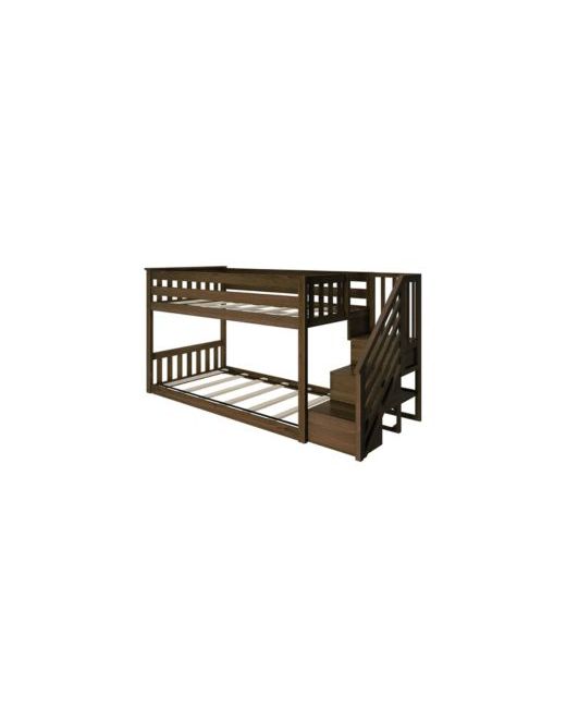 The Max and Lily Twin Over Twin Low Bunk Bed with Staircase is the perfect combination of fun and functional. The solid, knot-free wood bed frame adds strength and stability. This low bunk bed for kids uses a durable finish that s ideal for your clean and healthy home. Only 50 inches high, this space-saving low-profile bunk bed is great for smaller spaces and safe for younger children. The bottom bed sits only two inches off the floor, making it the perfect low bunk bed for little ones. Top bunk features tall 14-inch guardrails, so the bed safely fits standard mattress sizes. Staircase with rounded edges offers comfortable, easy climbing. Added bonus - the staircase can be installed on either the left or right side of the bed to fit your room perfectly. The slatted headboards and footboards and flush, color-matched hardware give these kids bunk beds a clean, modern look. Instructions, slat rolls, tools, and required hardware are included.