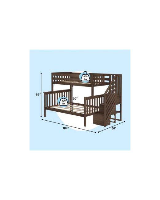 Now that s a win-win! The Max and Lily Twin Over Full Bunk Bed with Staircase is the perfect combination of functional and fun. Top bunk features tall 14" guardrails, so the bed safely fits standard mattress sizes. Staircase with rounded edges offers comfortable, easy climbing. Added bonus - the staircase is reversible and removable, so it is flexible to work with any space. Solid, knot-free New Zealand pine wood adds strength and stability. All Max and Lily products use a durable finish. The slatted head and footboards and flush, color-matched hardware give this bunk bed a clean, modern look. Instructions, slat roll, and required hardware are included. With solid plywood slats and a metal under-bed support bar for the top bunk, each sleeping surface can support 400 pounds of resting weight.