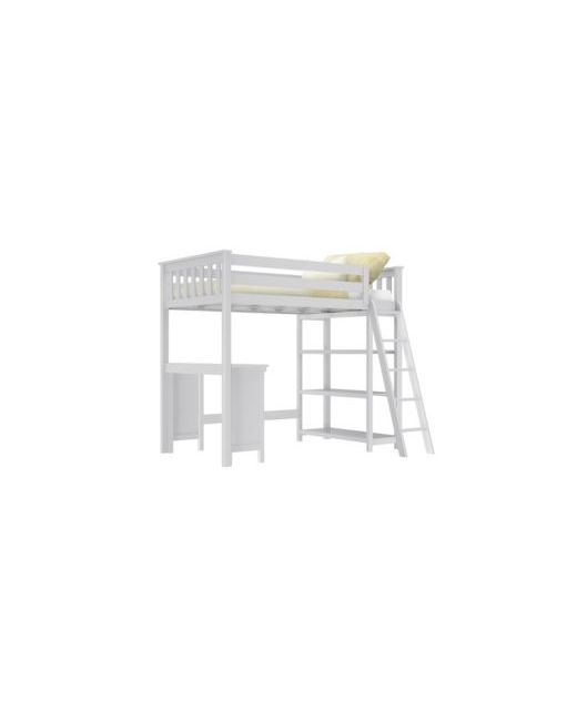 Now that s a win-win! The Max and Lily Twin High Loft Bed with Bookcase and Desk is the perfect combination of functional and fun. At 68.5 inches tall, this space-saving loft design is great for smaller rooms. A compact desk makes this your ideal homework and crafting spot. Storage shelves organize and display all your favorite items. Loft features tall 14" guardrails, so the bed safely fits standard mattress sizes. Angled ladder with rounded edges offers comfortable, easy climbing. Added bonus - ladder is both reversible and removable, so it is flexible to work with any space. Solid, knot-free New Zealand pine wood adds strength and stability. All Max and Lily products use a durable finish. The slatted head and footboards and flush, color-matched hardware give this loft bed a clean, modern look. Instructions, slat roll, and required hardware are included. With solid plywood slats and a metal support bar, this sleeping surface can support 400 pounds of resting weight.