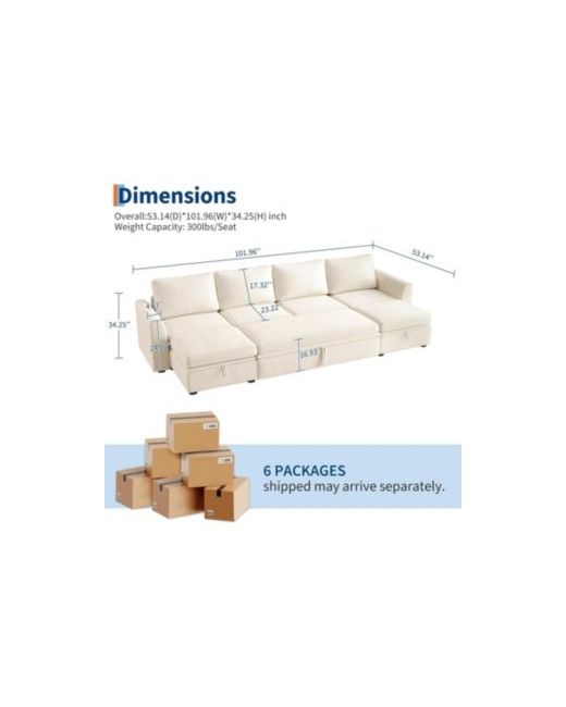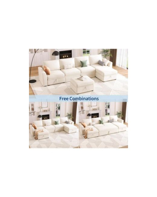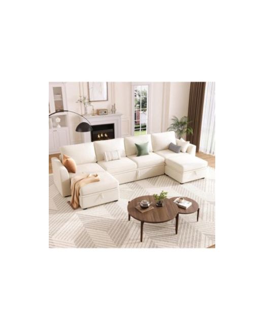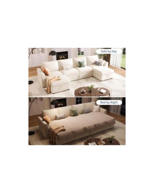 Beige Sectional Sleeper Sofa with Pull-Out Bed Chenille Modular Couch Storage and 2 Ottomans