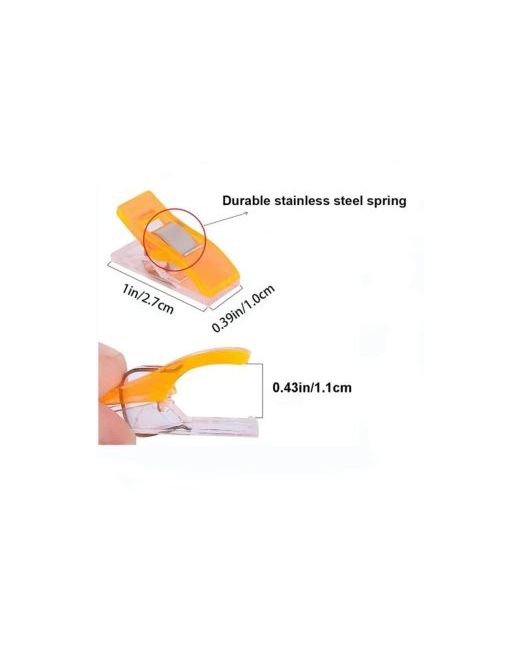 Sewing Clips Pack includes 100 pieces in 9 colors with plastic jar packaging. Made of high-quality Abs material and strong spring metal sheet. Clip opens wide to 11mm (0.43"), overall clip size measures 27mm x 10mm x 13mm (1.06" x 0.39" x 0.51"). Non-slip design easily holds multiple layers of fabric in place. Suitable for sewing quilts, Diy projects, quilting, binding and other fabric crafts.