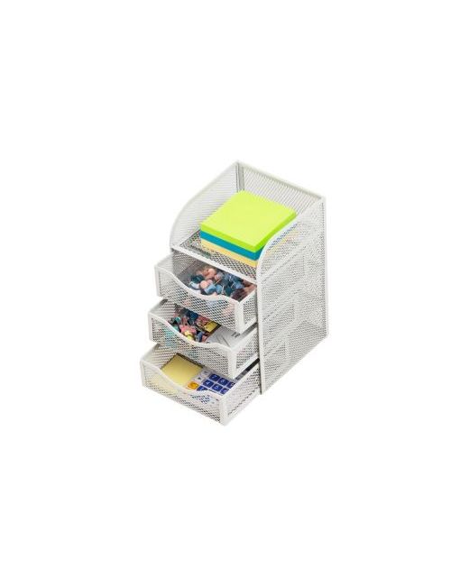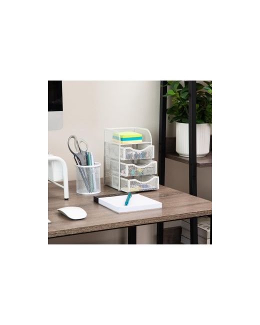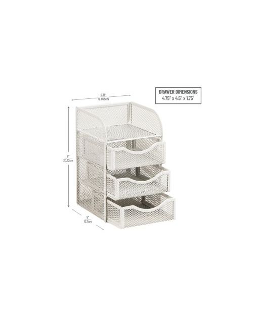 Space-Saving Design: The multi-section pull-out drawer maximizes desk or dresser space for organizing desktop supplies, jewelry, makeup, or crafting gear. Stylish Decor: Wire mesh shelves provide storage while adding elegance to your desk, bathroom, or makeup table. Durable Construction: Sturdy yet lightweight metal mesh stands up to everyday use. Versatile Functionality: Ideal for storing notes, paper clips, and desktop items, or for use on dressers and in kitchens. Compact Size: Measures 4.75 inches long, 5 inches wide, and 8 inches tall. Weight: 1.36 pounds.
