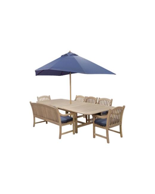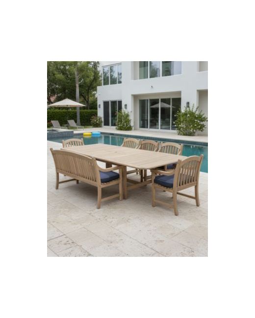 Wondrous teak construction provides an earthy feel to this beautiful seven-piece outdoor dining set. The gentle curves of the arm chairs are complemented by delightful rich toned fabric that blends magnificently with the natural teak.