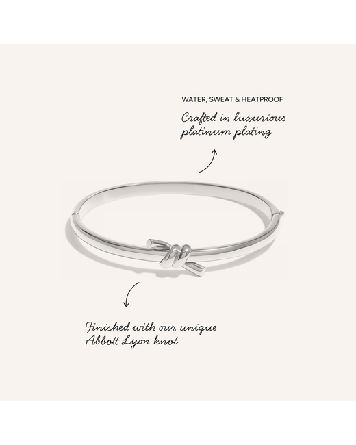 A timeless style with a subtle meaning, our silver twisted knot bangle is designed to be loved a lifetime. Crafted in platinum plating, this piece features our unique Abbott Lyon knot - a subtle symbol of love, loyalty, and promise. With a sleek silhouette and lasting shine, it's a heartfelt keepsake for yourself or someone you love. Pair it with our matching twisted knot hoops as a meaningful matching set. NEED TO KNOW Material: Platinum Finish Stainless Steel Five-year quality guarantee Comes in luxury packaging Available in sizes S/M (45mm x 55mm) & M/L (50mm x 60mm)