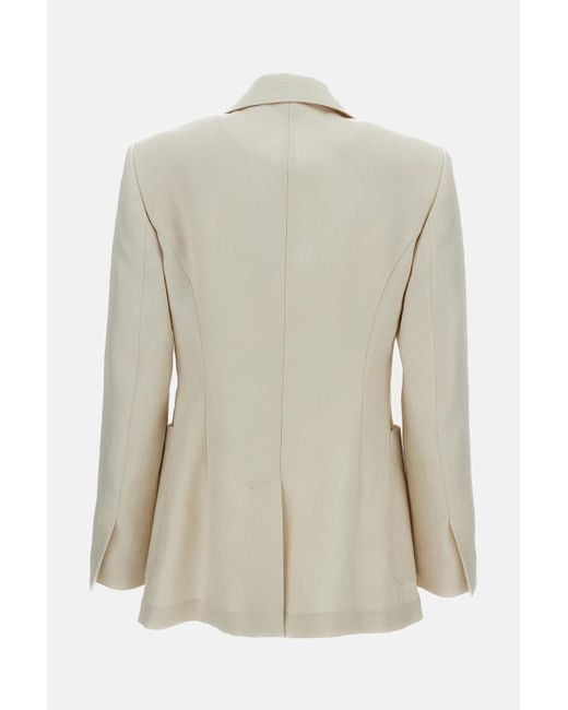 Single-breasted linen jacketLapel collarPatch pockets on the frontCuffs with slitsColor: BeigeMade in Italy