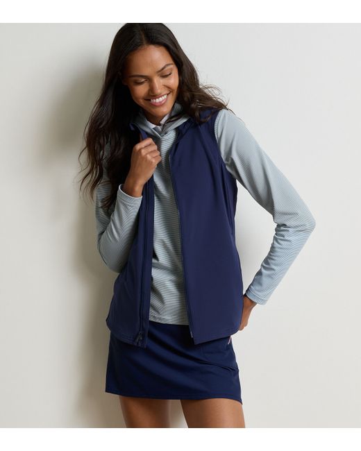 A soft quiet performance fabric anchors this windproof gilet with an inset rib-knit at the sides for a feminine shape and additional flexibility. Designed to move freely on the course and styled for versatility it's an easy-to-pair option perfect for breezy days. peter millar, peter miller, golfing, peter millar uk, peter millar uk golf