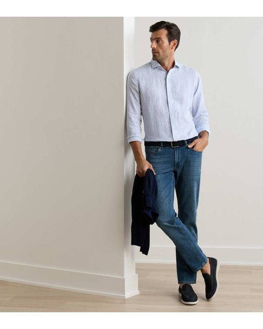 Our Vintage Washed Denim elevates timeless style with a masterful eye on the details and the perfect hint of stretch. The fabric showcases subtle whiskering and sanding for a casual lived-in look that's versatile enough to be worn with a T-shirt or paired with a blazer. They're finished with an Italian leather back patch and classic five-pocket styling. peter millar, peter miller, golfing, peter millar uk, peter millar uk golf