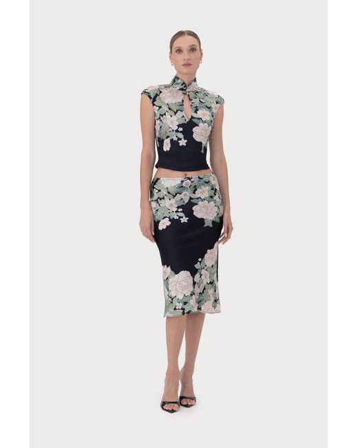The Dara top is a cheongsam-inspired design with cap sleeves, crafted from luxurious satin featuring a peony-inspired hand-placed print for each piece. The refined mandarin collar and low keyhole details add contemporary appeal, making this top the perfect complement to the Dara skirt.