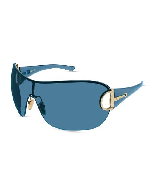 These mask sunglasses from Gucci feature solid lenses and a rimless silhouette with a half horsebit detail on the sides. 100% UV protection Solid lenses Adjustable nose pads Metal/bionylon Made in Japan ABOUT THE BRAND First launched in 1921, the Italian luxury fashion house quickly became known for its fine leather craftsmanship and accessories. Today, the visionary brand continues to redefine fashion trends, while celebrating creativity and innovation. Gucci's contemporary designs include shoes, clothing and accessories-as well as bold beauty and fragrance collections. Soft Accessories - Mens Sunglasses > Gucci > Saks Fifth Avenue. Gucci. Color: Gold Blue.