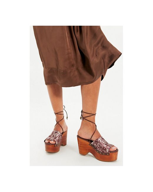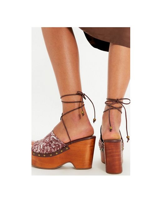 Bring groovy, printed style to any outfit with these major platform clogs from FP Collection, featuring an open-toe design, wrap straps, and studded accents for a new take on a favorite style. * Printed textile uppers * Platform clog style * Wraparound ankle strap * Pine wood platform sole * **Platform Height:** 2 in, **Heel Height:** 3.82 in Front Row Printed Wrap Clogs by Free People in Horses Bandana, Size: US 7