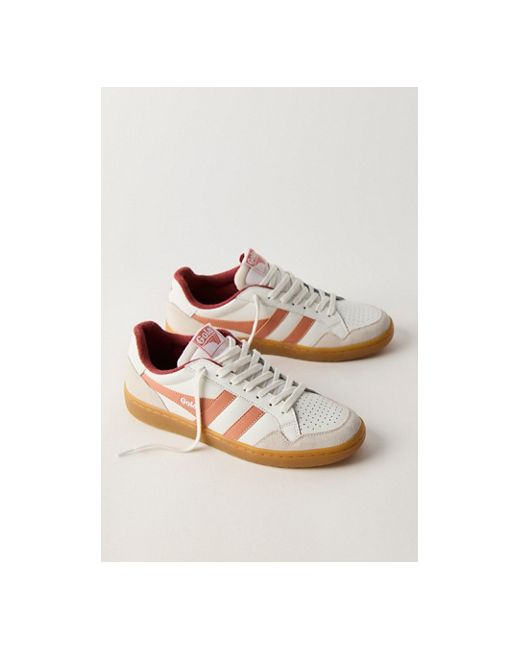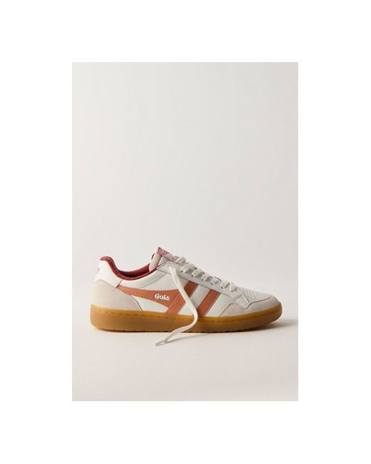 Retro-court style is the moment with these simple sneakers from Gola, featured in a low-top style with perforated details, suede overlays, and soft terry lining. **Features:** Low-top style, leather uppers, perforated toe box, suede overlays, terry lining, rubber cup sole, lace-up closure **Why We Gola Eagle Trainers Shoe at Free People in White/Terracotta/Red Ochre, Size: US 7