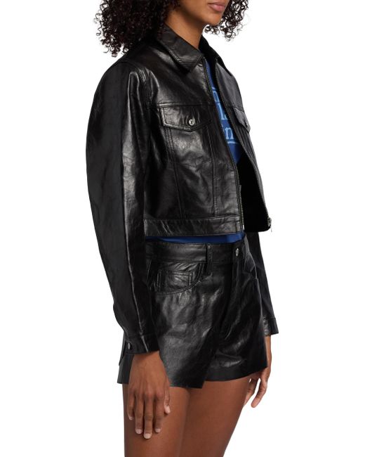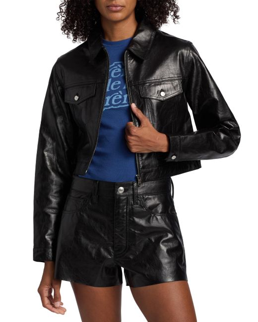 Crafted of supple leather, this cropped trucker jacket from Re/done features a point collar, front zipper, and dual chest flap pockets with silvertone buttons. Point collar Long sleeves, button cuffs Chest button-through flap pockets Front zip closure 100% leather Dry clean Imported SIZE & FIT About 18.5" from shoulder to hem Model measurements: 5'10" tall Model is wearing a US size Small. Contemporary Sportswear - Denim And Bottoms > Re/done > Saks Fifth Avenue. Re/done. Color: Black. Size: XS.