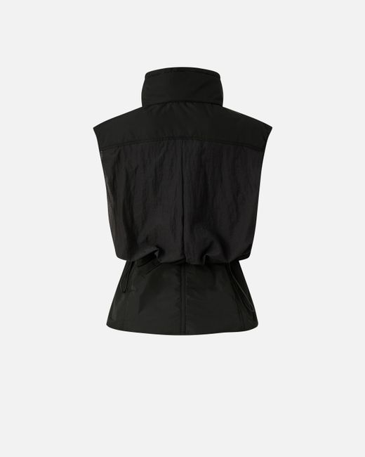 Sleeveless down jacket featuring a two-material composition: an upper section in crisp organza nylon ripstop and a lower section in technical taffeta-effect fabric, creating a contemporary blend of lightness and structure. The upper part features a stand-up collar, a concealed zip and press-stud fastening, two pockets with flap, one of which is finished with matching embroidered PINKO logo lettering, and two drawstrings: one on the neck and one at the hem for a customizable waist adjustment. The lower part of the down jacket has a two-slider zip and hidden pockets.