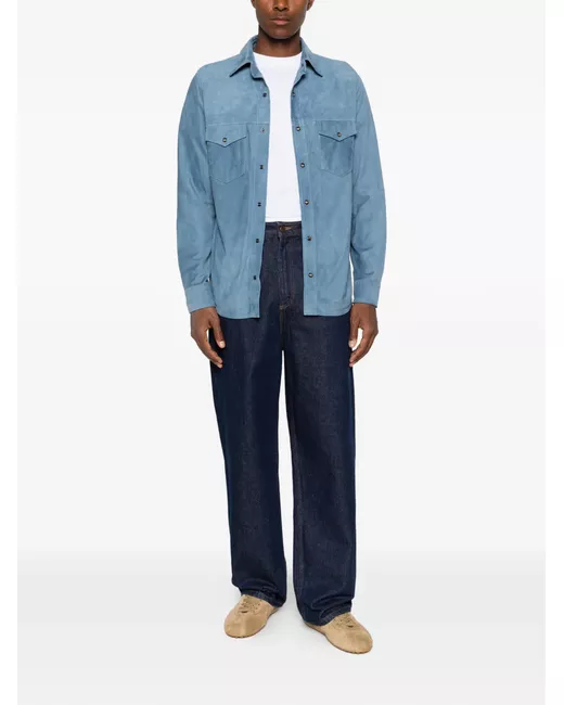 blue suede finish front button fastening long sleeves two chest flap pockets buttoned cuffs curved hem