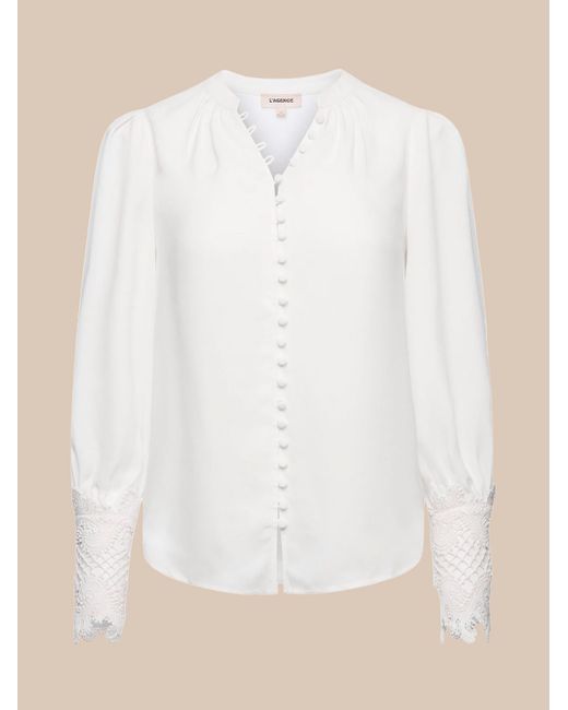 A sublimely chic blouse in ivory. Features vintage-inspired self-button-loop closure and extended cuffs done in exquisite scalloped guipure lace. Relaxed high-low silhouette gathered into band collar. Long sleeves with pleated caps. Front button closure. L'AGENCE Ava Blouse Top In Ivory