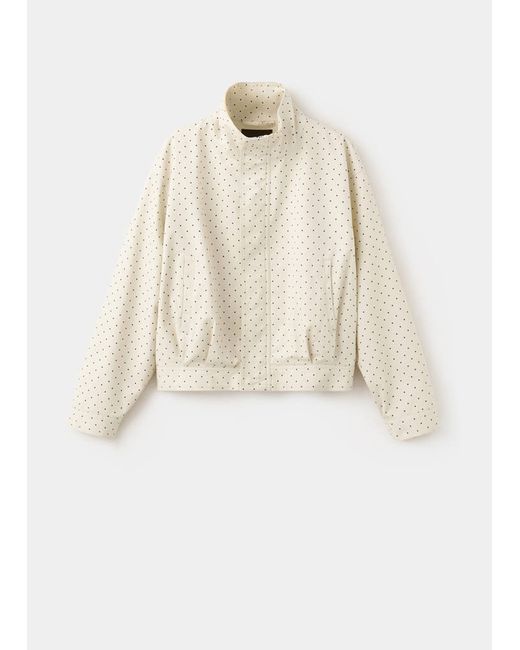 100% cotton fabric, Bomber design, Long sleeves, Funnel neck, Spots print, Two side pockets, Concealed zip and button fastening
