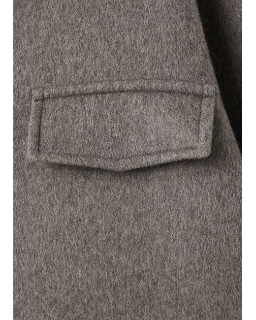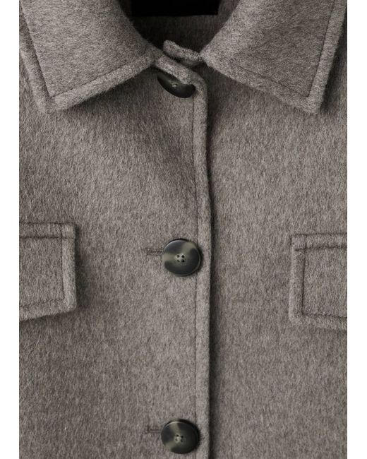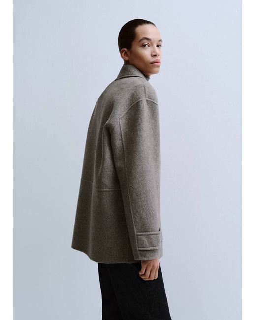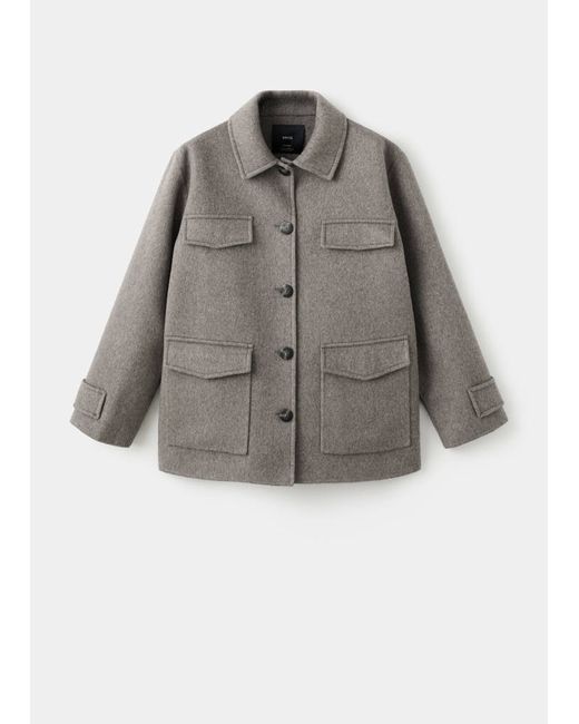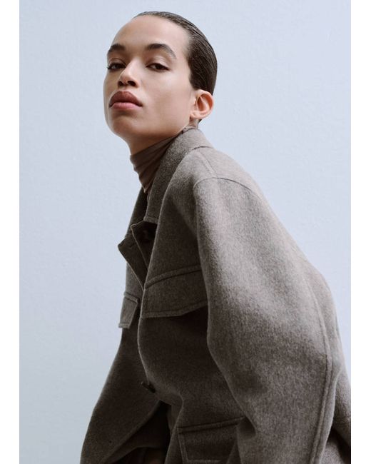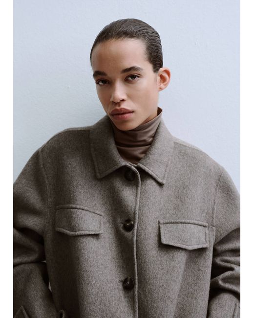 Wool mix fabric, Straight design, Long design, Shirt collar, Long sleeves, Four patch pockets on the front, Button fastening at the front