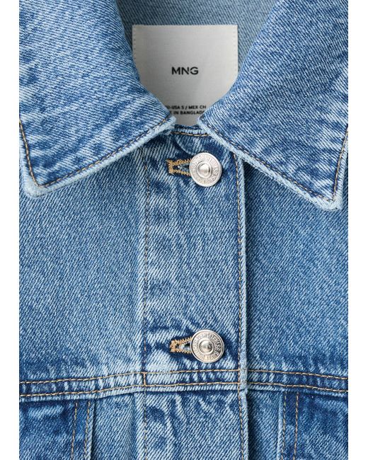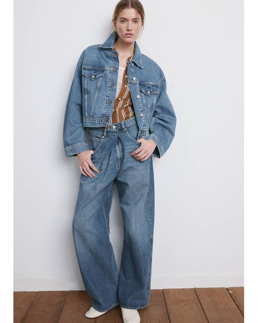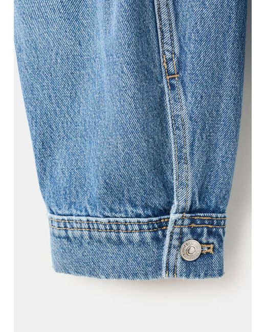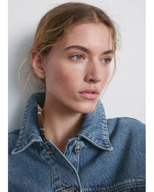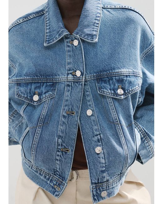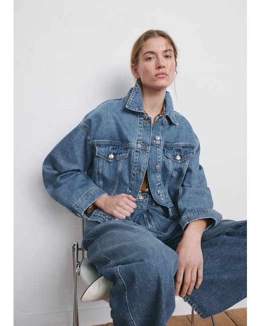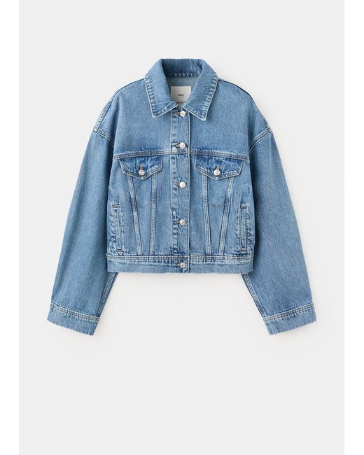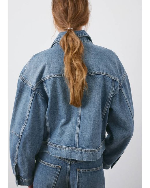 Denim-style cotton fabric, Oversized design, Crop design, Shirt collar, Long sleeves, Long sleeves with buttoned cuffs, Two patch and flap pockets on the chest, Front closure with buttons