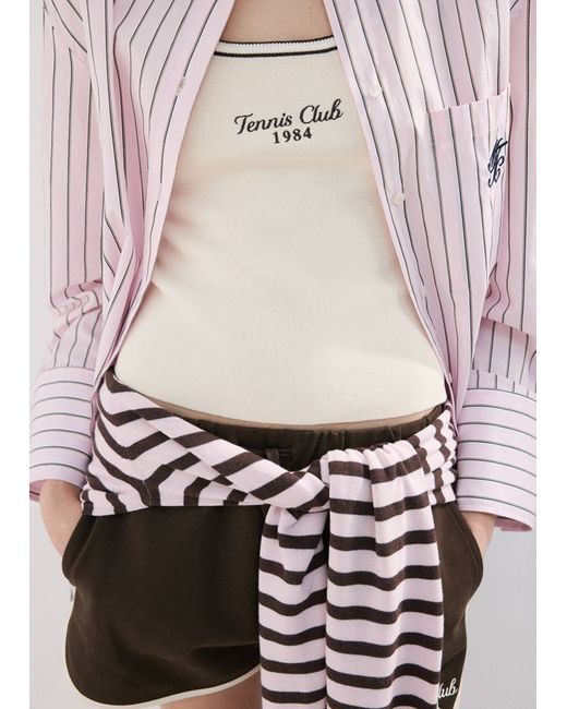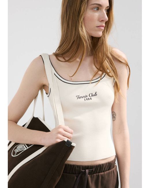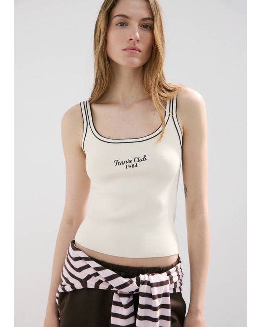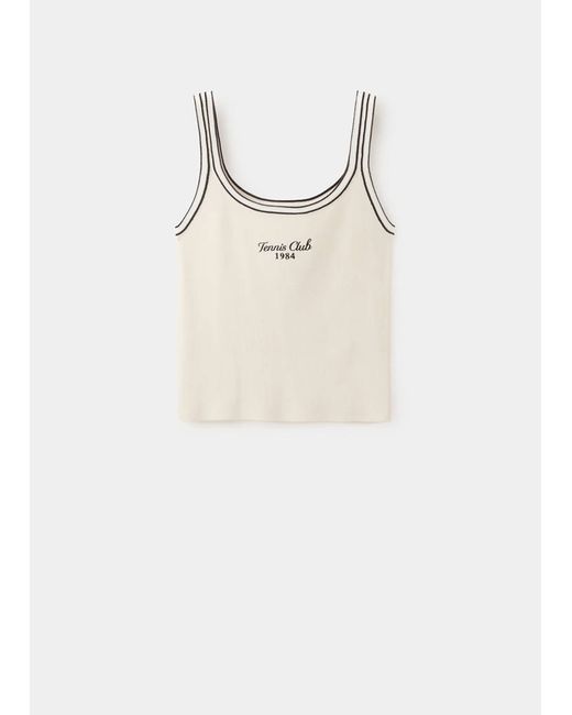 Fine knit fabric, Fitted design, Embroidered message, Low neckline, Sleeveless, Thin straps, Contrast trims, No Fastening, Total look, Godo Collection, As a tribute to one of the most social sports, and in celebration of our sponsorship of the Barcelona Open Banc Sabadell 73rd Trofeo Conde de Godó, we are launching a collection of curated garments that represent the most sophisticated side of tennis with retro details.